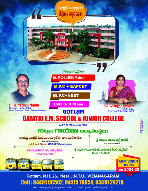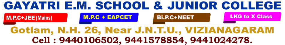 GAYATRI ENGLISH MEDIUM SCHOOLE & SRI GAYATRI JUNIOR COLLEGE seeks to create a challenging yet conducive learning environment that inspires excellence and encourages high performance through engagement of varied instructions that allows for individual differences and learning styles.
