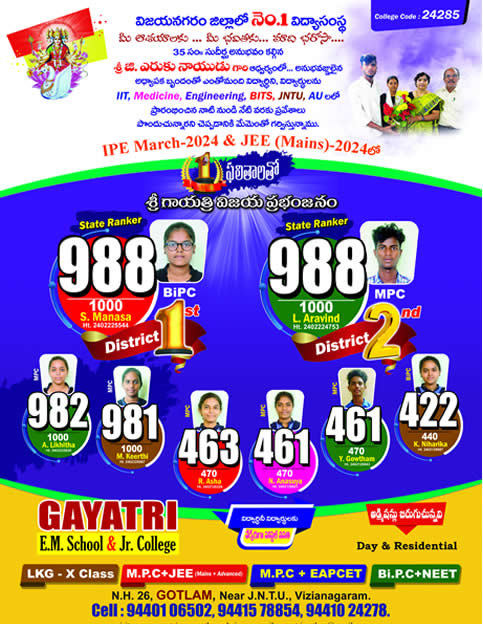 Welcome to Gayatri English Medium School & Sri Gayatri Junior College, where education goes beyond textbooks to enrich young minds with holistic learning experiences. With a commitment to nurturing every student, we offer a concept-oriented curriculum that sparks curiosity and fosters critical thinking. At Gayatri English Medium School & Sri Gayatri Junior College, we believe in providing not only academic excellence but also emotional support, ensuring each student feels valued and empowered to achieve their full potential. Our student-friendly approach encourages exploration and growth, creating a supportive environment where lifelong friendships are formed. Join us at Gayatri English Medium School & Sri Gayatri Junior College, where education is an inspiring journey of discovery, compassion, and achievement.